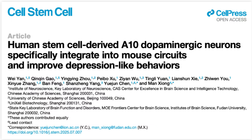 2025 年 8 月 11 日,中國科學院腦科學與智能技術卓越創(chuàng)新中心陳躍軍團隊與復旦大學腦科學研究院熊曼團隊合作,在 Cell 子刊 Cell Stem Cell 上發(fā)表了題為:Human stem cell-derived A10 dopaminergic neurons specifically integrate into mouse circuits and improve depression-like behaviors 的研究論文。