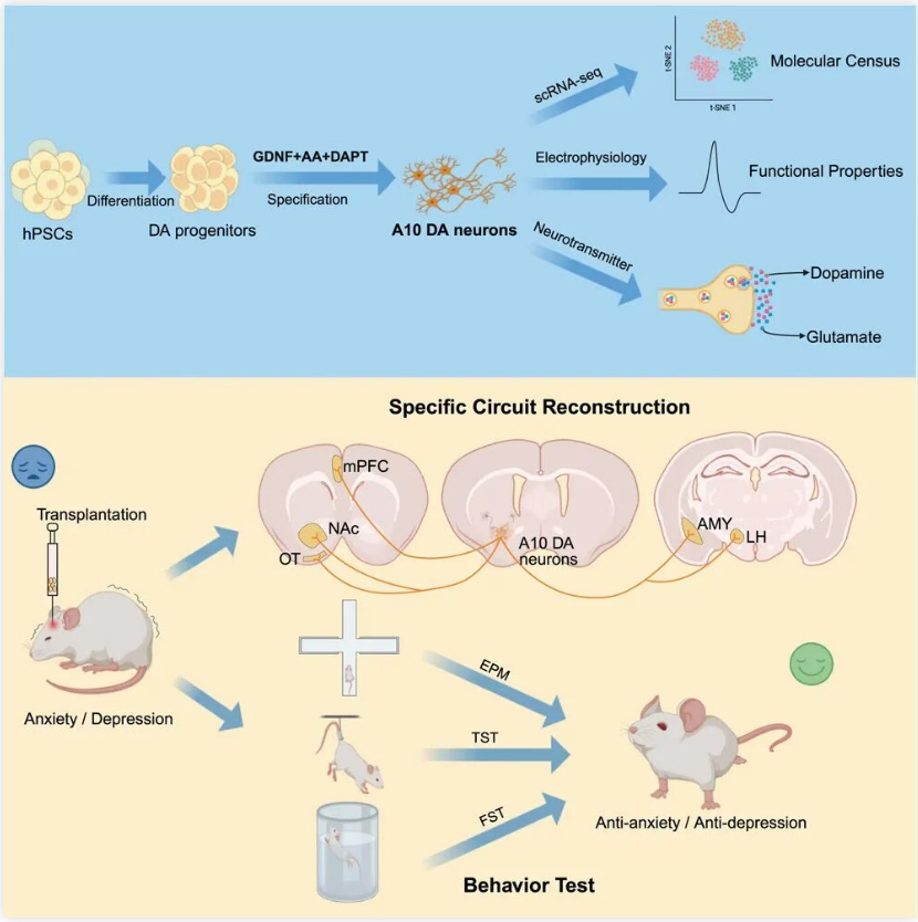 該研究開發(fā)了一種從人類多能干細胞(hPSC)高效分化生成 A10 亞型中腦多巴胺能神經(jīng)元(A10 mDA)的方法,證明了 A10 mDA 可特異性整合到小鼠的大腦神經(jīng)回路,從而發(fā)揮抗焦慮、改善抑郁樣行為的效果。